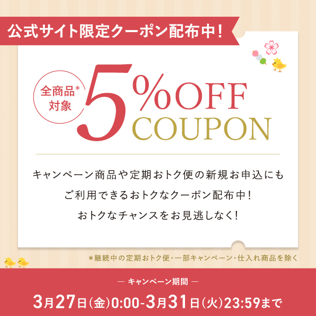 いつも豆腐の盛田屋をご利用いただき、誠にありがとうございます。 全商品対象(※)『5%OFFクーポン』キャンペーンがスタートしました。 キャンペーン商品や「定期おトク便」の新規お申込みにもご利用いただける、大変お得なクーポンです。 この機会をお見逃しなく、ぜひご利用ください。 〈クーポン内容〉 全商品対象(※)『5%OFFクーポン』 ※ 継続中の定期おトク便・一部キャンペーン・仕入れ商品を除く 〈キャンペーン期間〉 2026年3月27日(金)0:00~3月31日(火)23:59まで 〈クーポンのご利用方法〉 商品をカートに入れた後、カートページにて使用したいクーポンを選択してください。 ◎ログイン後のカート画面にてクーポン選択ができます。 ◎クーポン金額条件を満たした場合にクーポンが表示され、選択できます。 〈クーポンのご利用条件〉 ・おひとり様1回限り ・クーポンは一度のお買い物で1枚のみ使用可能です。 ・お持ちのポイントとクーポンは、一度のお買い物で同時に利用可能です。 ・既にご契約中の定期便、一部仕入れ商品にはご使用いただけません。 ・豆腐の盛田屋公式サイト(楽天/Amazon除く)のお買い物でご利用いただくクーポンのため、お電話/ハガキ/FAXではご利用いただけません。 〈クーポンのご確認方法〉 クーポンはマイページの「クーポンBOX」よりご確認いただけます。 → マイページはこちら